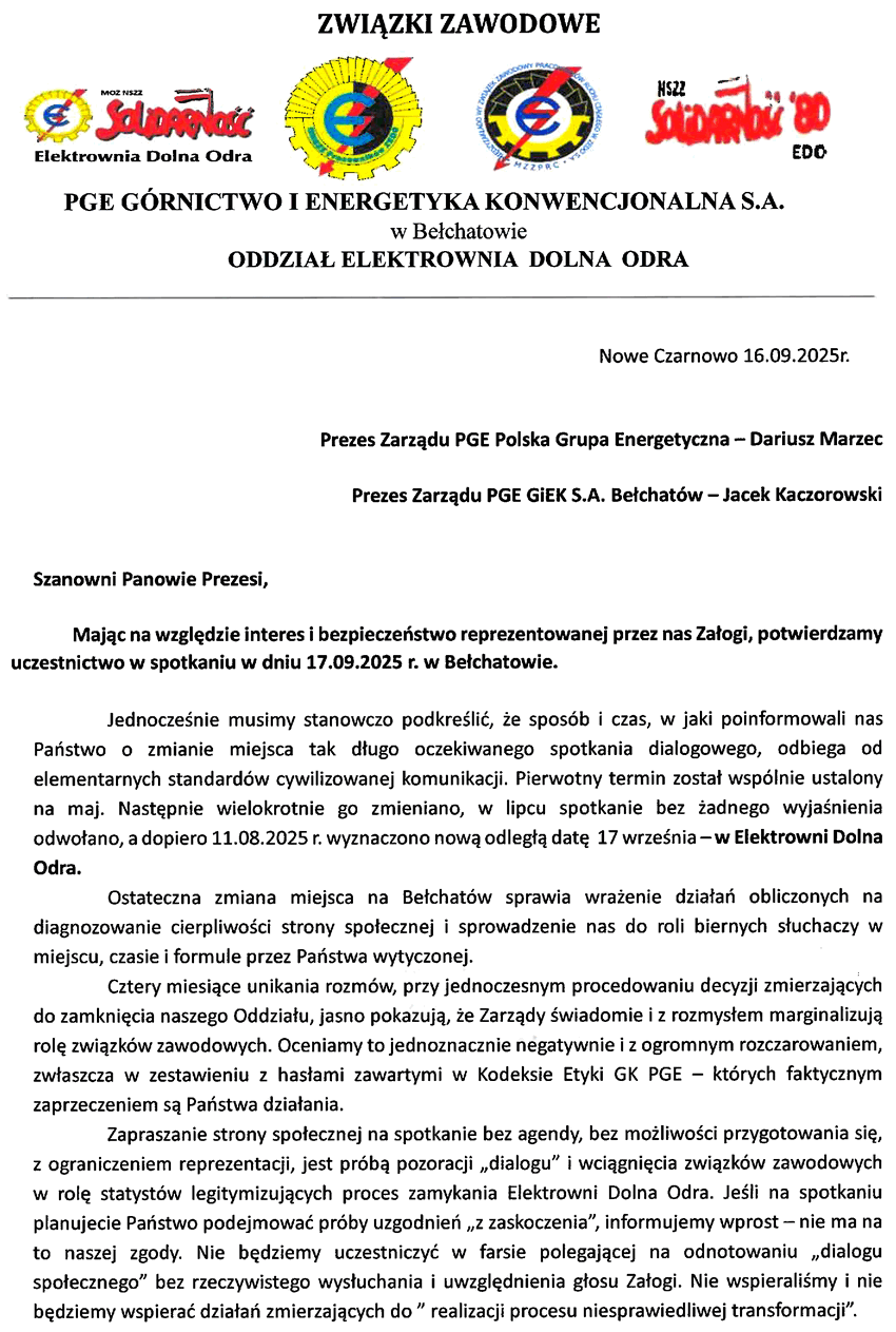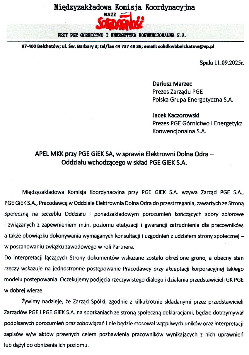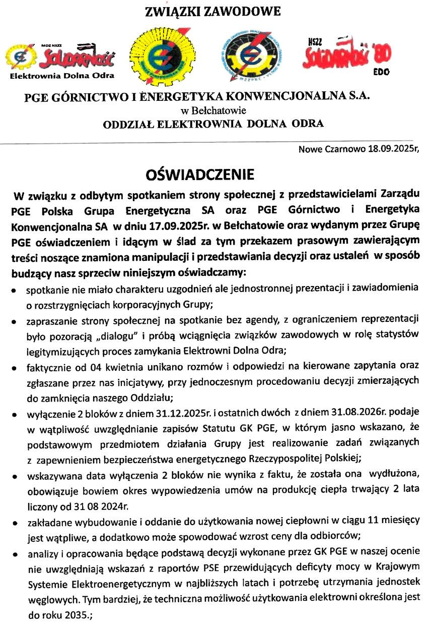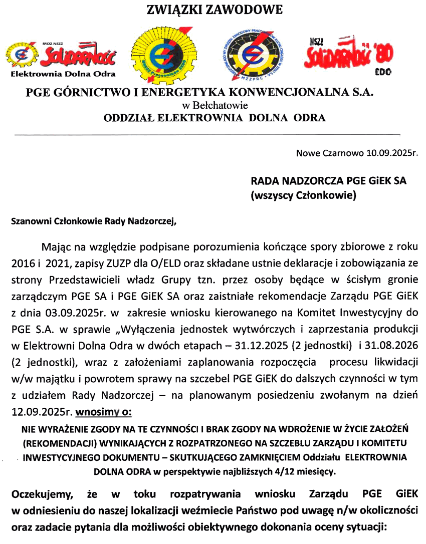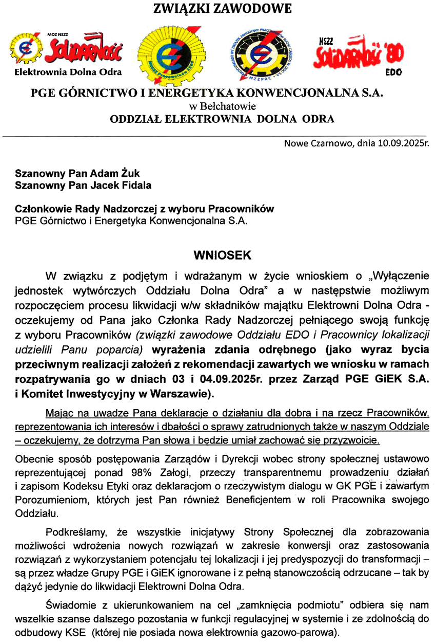 | Strona główna Komunikaty Statut Związku Skład Komisji Świadczenia statutowe Galeria zdjęć Historia Kontakt Telefon: 91 822 50 01 e-mail: solidarnosc.giekeld@gkpge.pl Adres: MOZ NSZZ Solidarność Elektrownia Dolna Odra 74-105 Nowe Czarnowo 76 Numer konta: 39 1240 1864 1111 0000 2207 1497 Bank PEKAO VII O/Szczecin   | ||