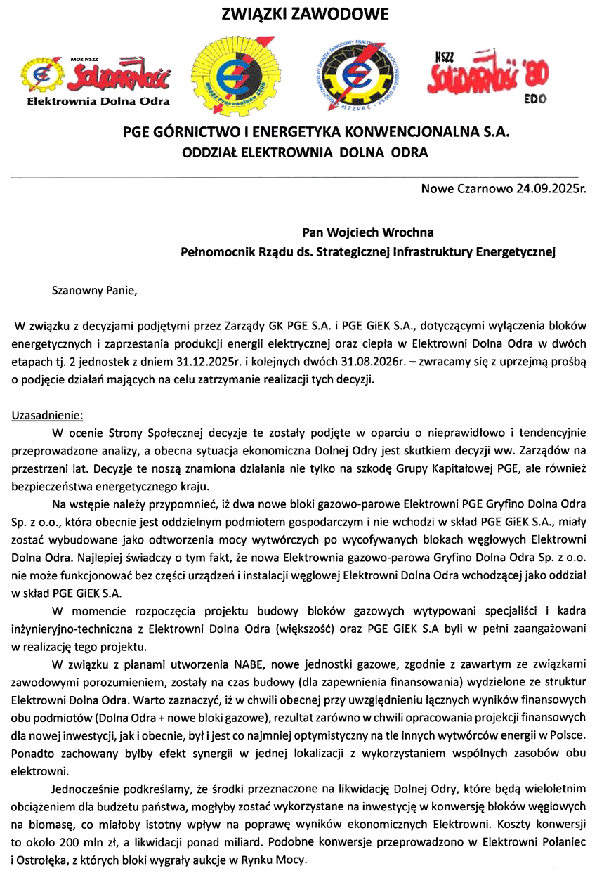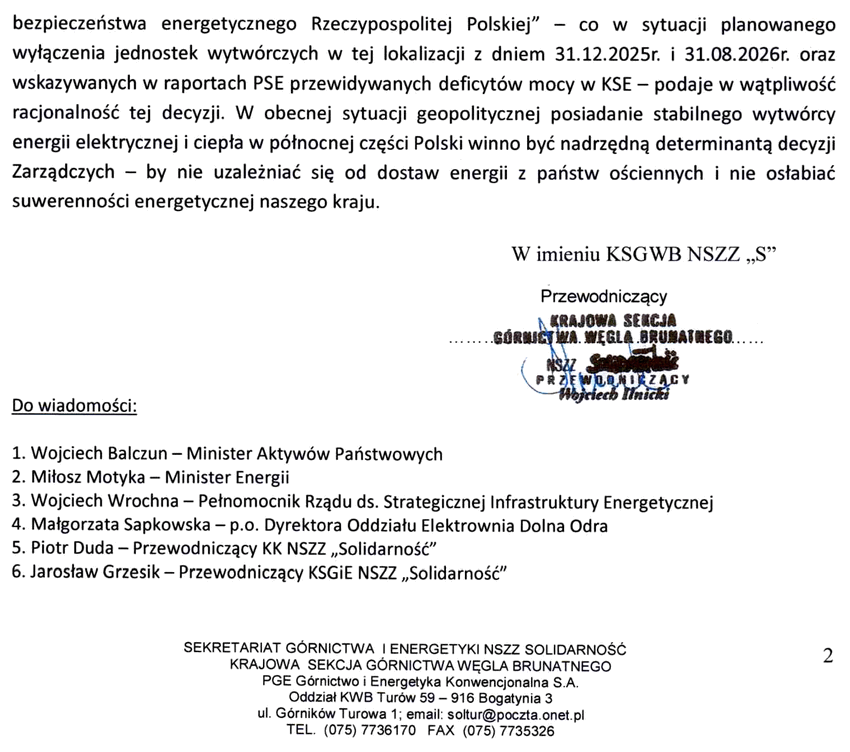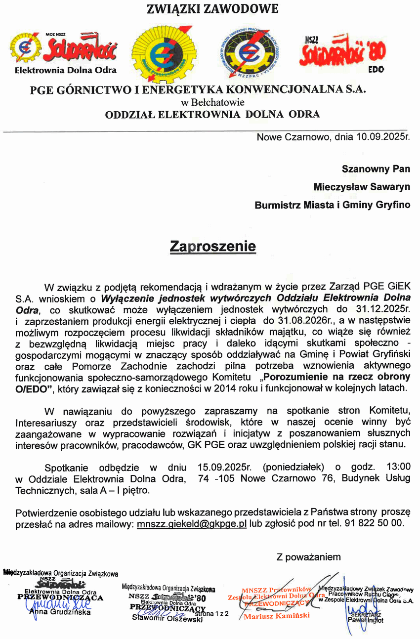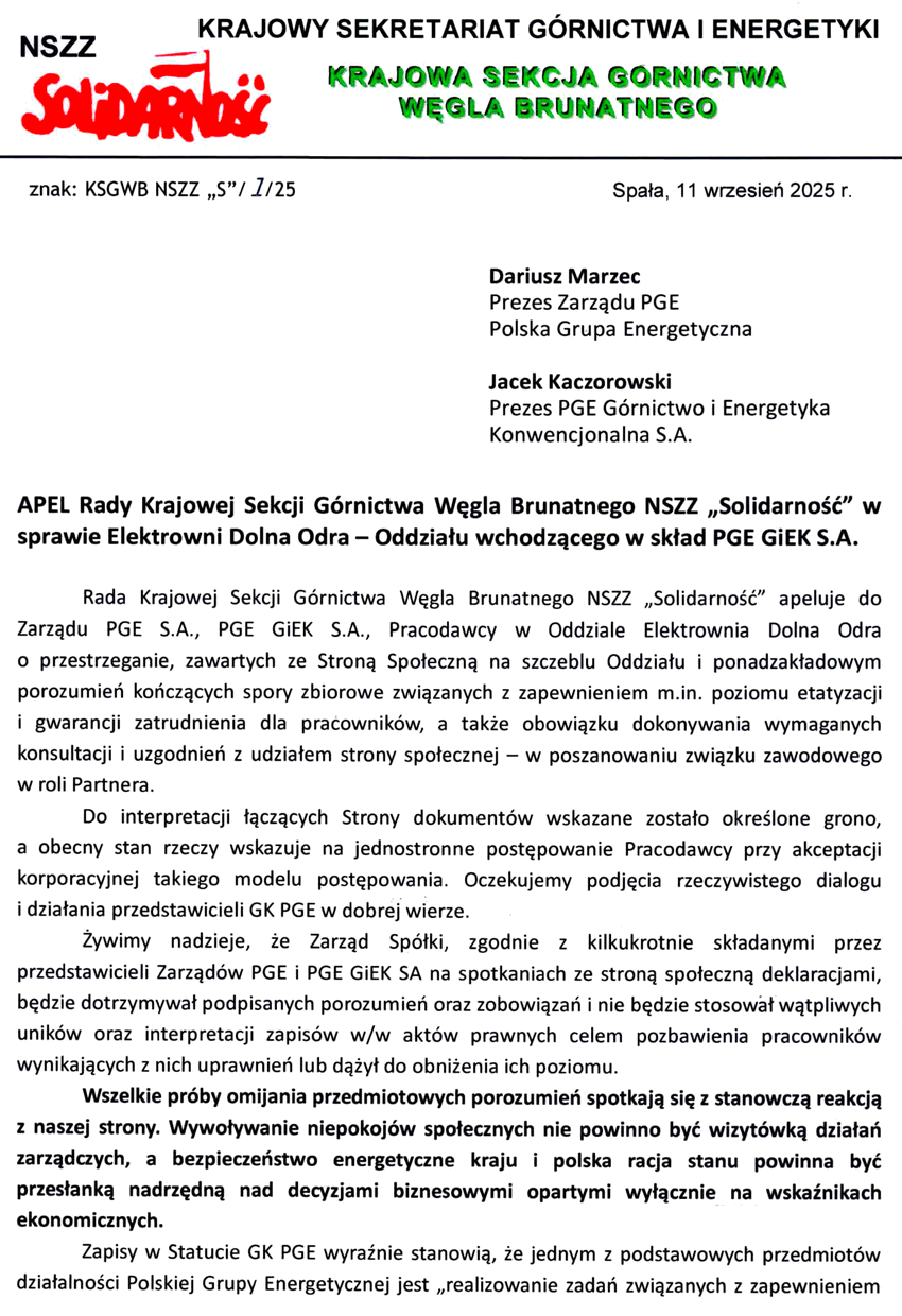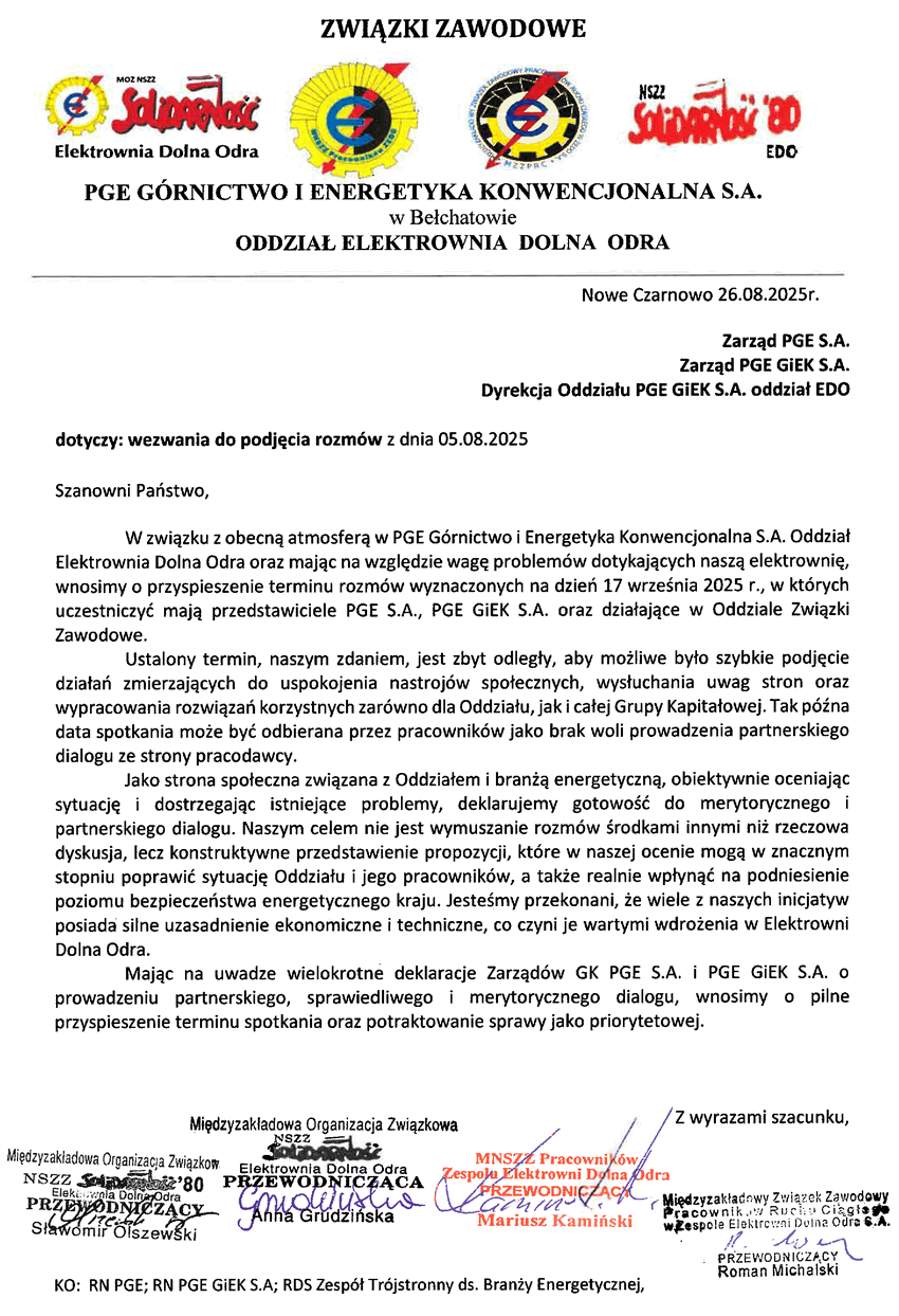 | Strona główna Komunikaty Statut Związku Skład Komisji Świadczenia statutowe Galeria zdjęć Historia Kontakt Telefon: 91 822 50 01 e-mail: solidarnosc.giekeld@gkpge.pl Adres: MOZ NSZZ Solidarność Elektrownia Dolna Odra 74-105 Nowe Czarnowo 76 Numer konta: 39 1240 1864 1111 0000 2207 1497 Bank PEKAO VII O/Szczecin   | ||